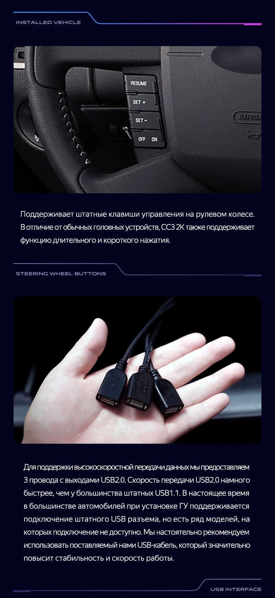 Только в линейке СС3 реализовано программное обеспечение, которое отображает трёхмерную картинку движения автомобиля. Благодаря установленному трёхосному датчику гироскопа на дисплее магнитолы отображается автомобиль в 3D-плоскости (доступны повороты 360о, динамические данные).
