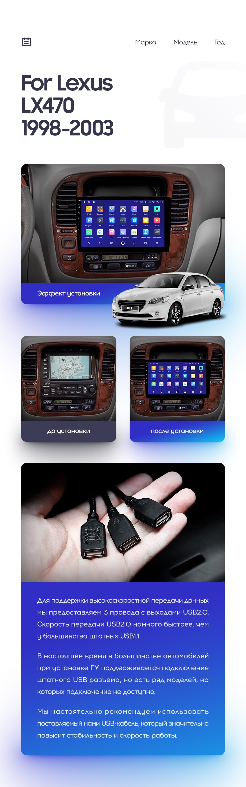 Полный комплект установки магнитолы Teyes с рамкой и проводкой можно выбрать в каталоге штатных магнитол Lexus LX470 J100 (1998-2003).